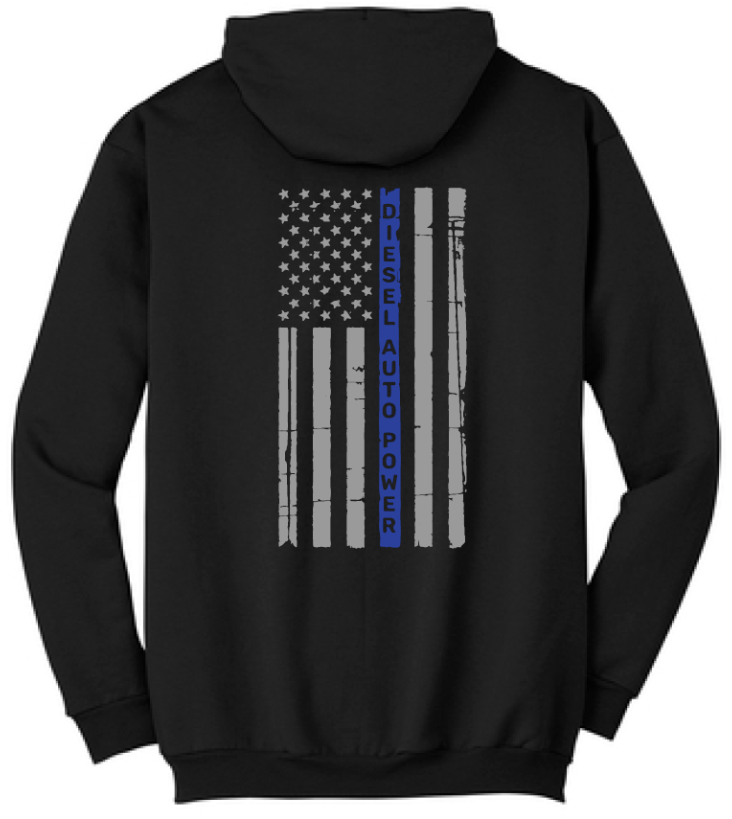 **New Hoodie** DAP American Flag hoodie With Blue line, Quality 9-ounce, 50/50 cotton/poly fleece, Air jet yarn for a soft, pill-resistant finish with a Two-ply hood.
