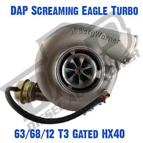The DAP Screaming Eagle SXE 63/68/12 T3 Gated is a great performance upgrade turbo for the 5.9L Cummins while maintaining great street and towing manners.The 68mm turbine wheel will spool relatively fast and offer great all around performance for a daily driver and towing application. While heavy towing is possible, your tire size, gearing and tuning will play a major role along with choosing the correct exhaust housing for your application. Built with the latest genuine Borg Warner SXE technology it comes standard with a Forged Mill Wheel (FMW) and 360-thrust bearing. Turbo is modified for fitment into the 1991.5-2002 Dodge applications by DAP with a machined v-band compressor outlet and your choice of turbine housing cut to an HX40 4" down pipe flange.